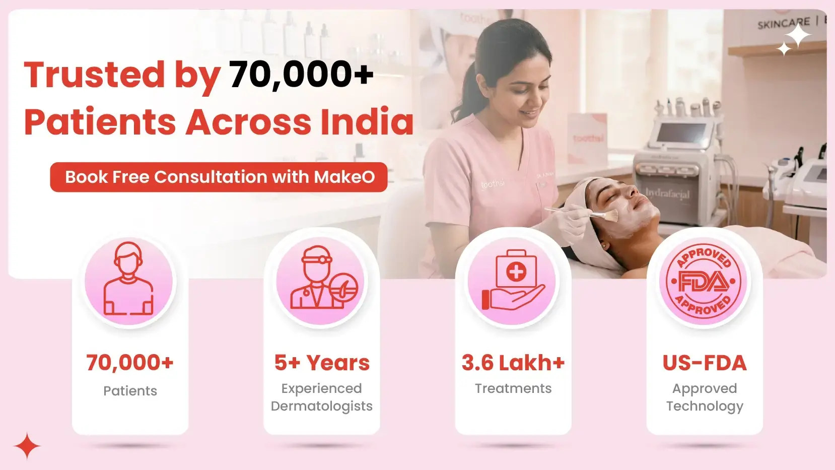 MakeO Skin & Hair Clinic has dermatologists who have treated 70,000+ patients across India while delivering over 3.5 lacs+ treatment sessions across skin and hair treatments.