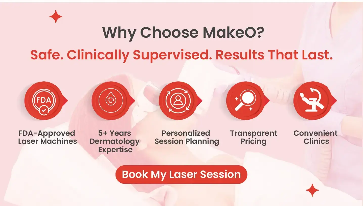 - Transparent Pricing If you’re wondering how much it costs for facial laser hair removal or comparing laser facial hair removal costs in India, MakeO offers clear, upfront pricing with no hidden charges, helping you plan your treatment confidently.