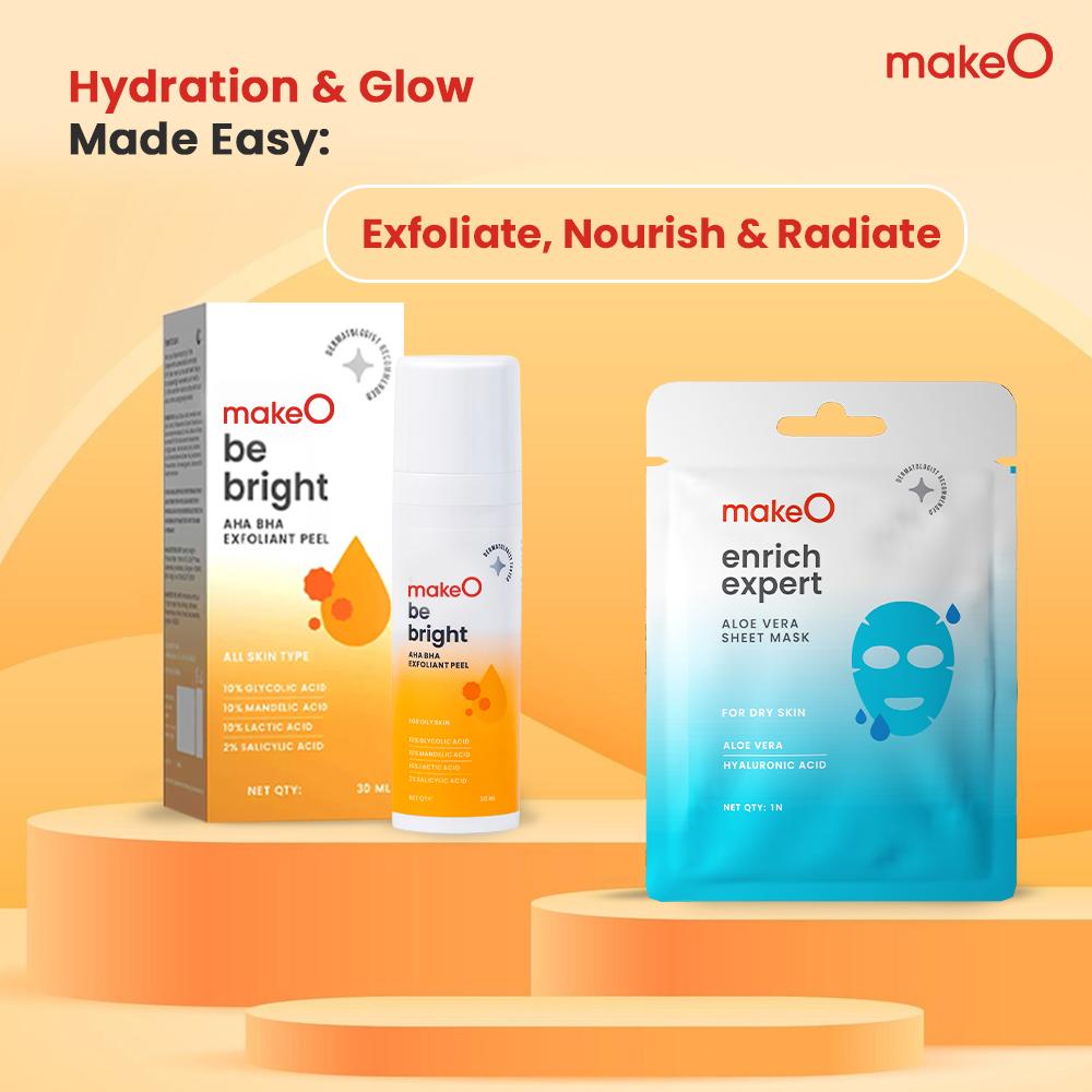 hydrating diy facial kit is the one-stop solution for hydrated skin & instant glow to your sensitive & dry skin. This kit has the be bright AHA BHA exfoliating peel & Enrich Expert Aloe Vera Sheet Mask. This combo is a quick & DIY solution to give you bright, radiant & glowing skin.