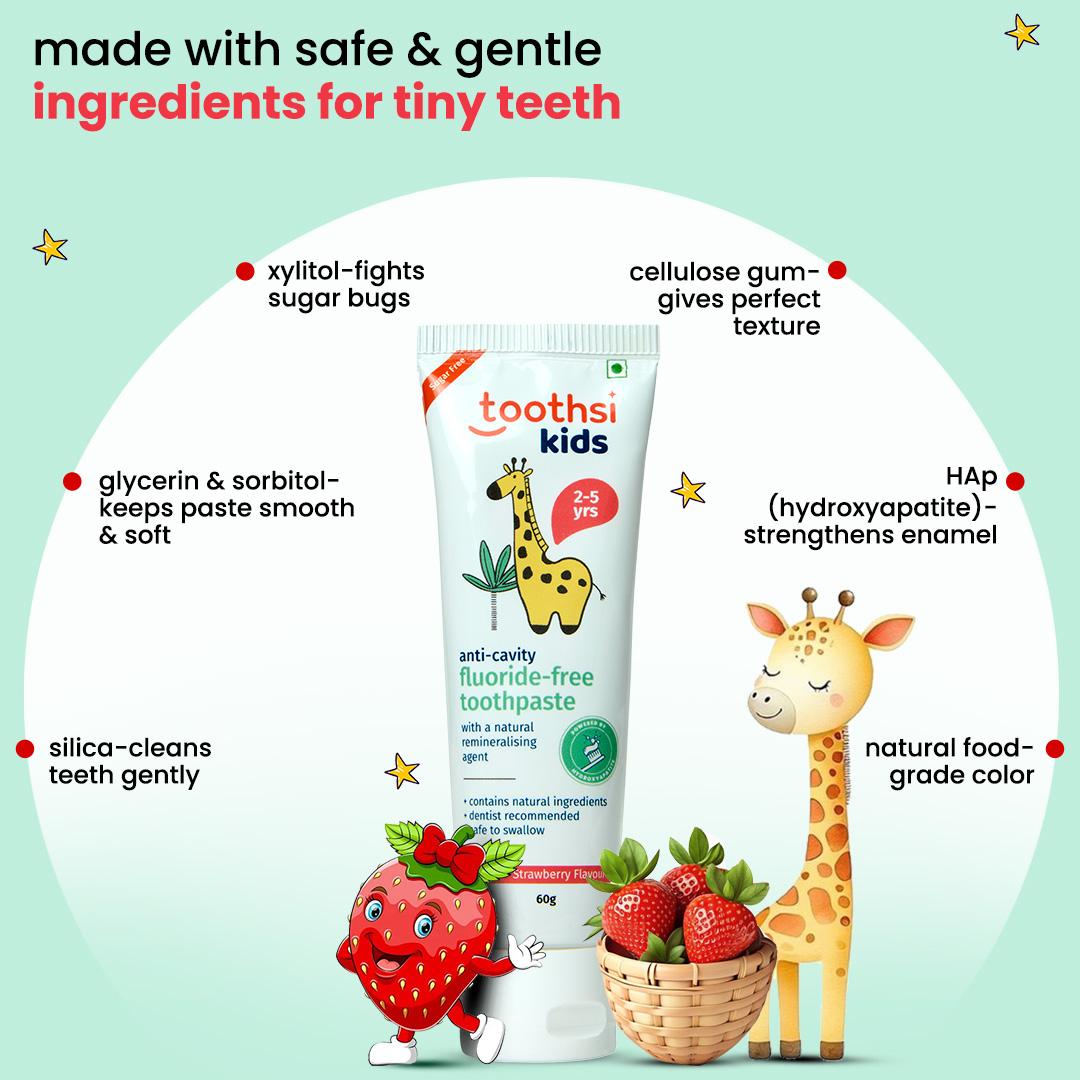 Toothsi Fluoride Free Toothpaste | Kids Tooth Paste for Ages 2-5 | Powered with Hydroxyapatite | Anti Cavity | Kids Paste | Natural Ingredients | Vegan & Cruelty Free | Strawberry Flavour | 60g