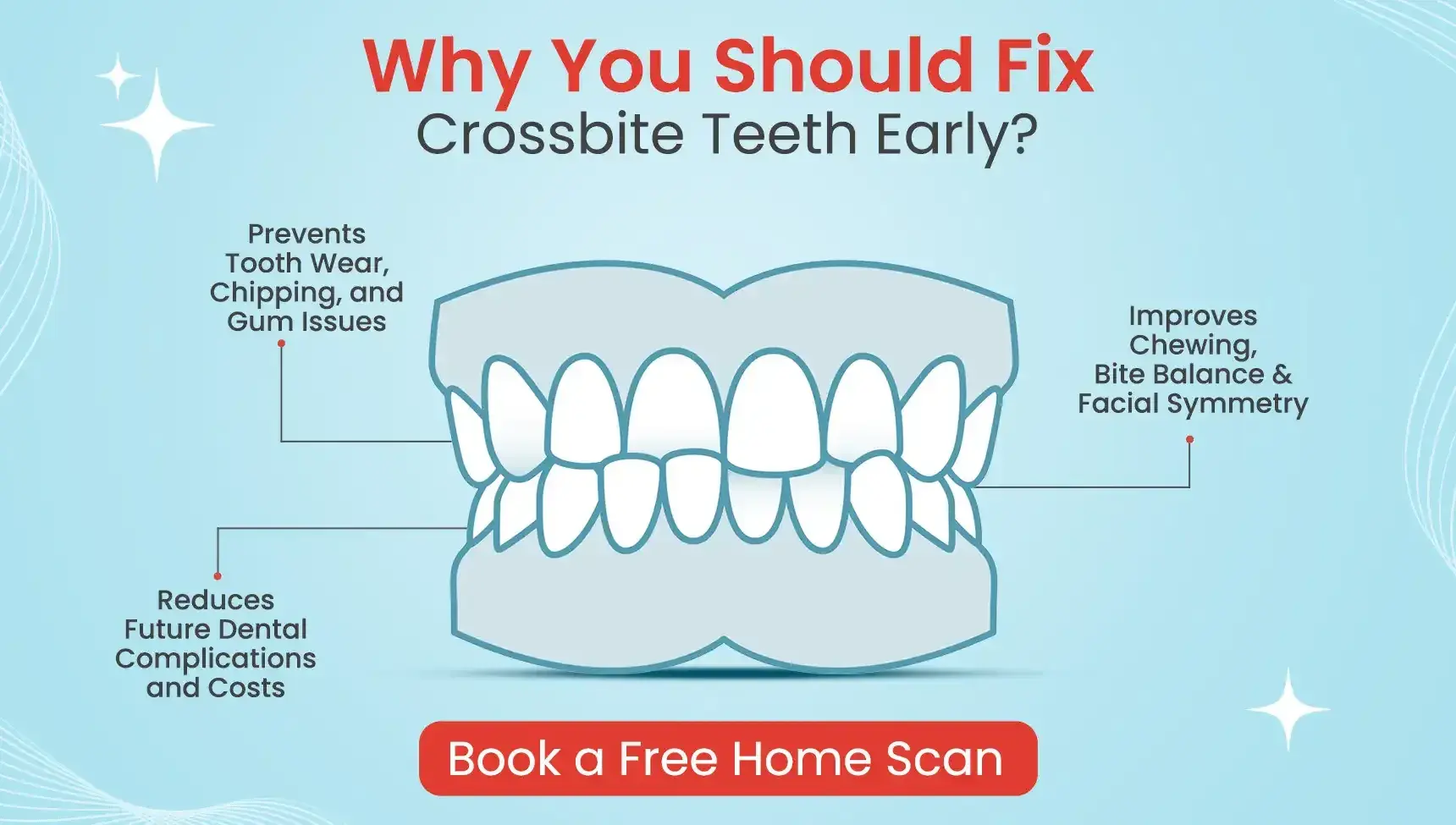 Now you can book a free home scan where our dental professionals will visit your location for Crossbite treatment. This initial scan captures the precise positioning of your Crossbite Teeth. The scanning process is quick, painless, and non-invasive, and there are no messy impressions or uncomfortable moulds required.