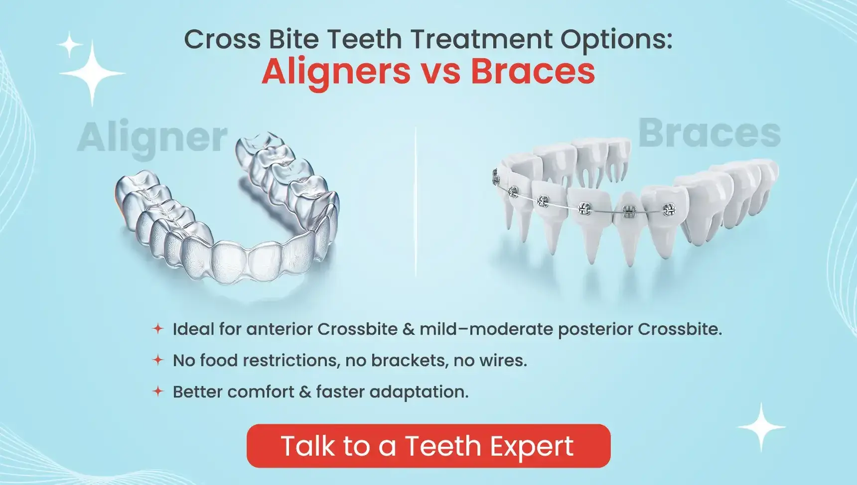 - No food restrictions, no brackets, no wires: One of the biggest advantages of choosing aligners for Crossbite Correction is the freedom they provide in your daily life. Unlike traditional braces that come with endless lists of forbidden foods, aligners are completely removable, meaning you can eat absolutely anything you want without worrying about damaging your Crossbite Treatment.